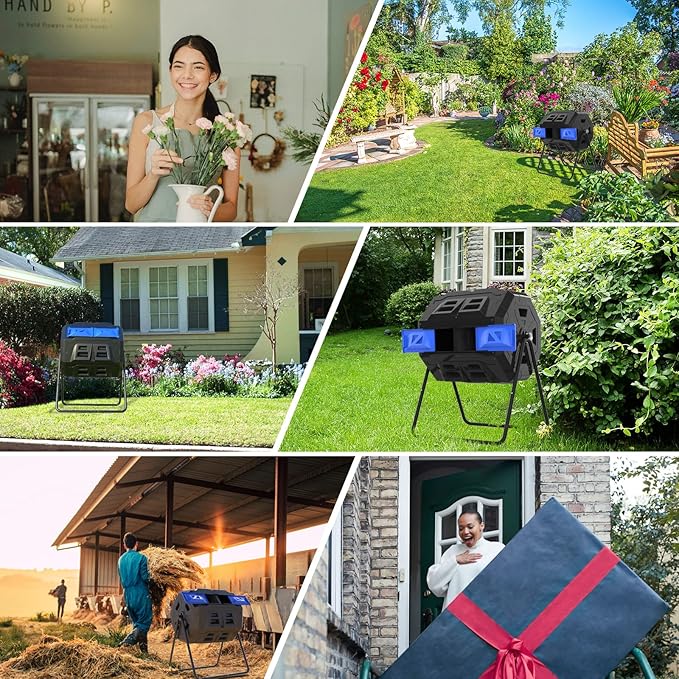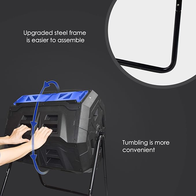 SQUEEZE master Large Compost Tumbler Bin - Outdoor Garden Rotating with Thermometer -Automatic Temperature Measurement-Sturdy Steel Frame - 43Gallon (2-21.5Gal)- Blue Door